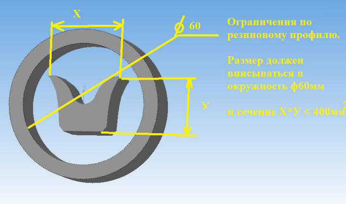 Размер профиля должен вписываться в окружность ф60мм. Площадь профиля Х*У быть не более 400мм2 Если профиль имеет значительную разницу толщины стенок в разных честях, то сечение профиля должно быть еще меньше чем 400мм2. Такой профиль рассчитывается индивидуально.
